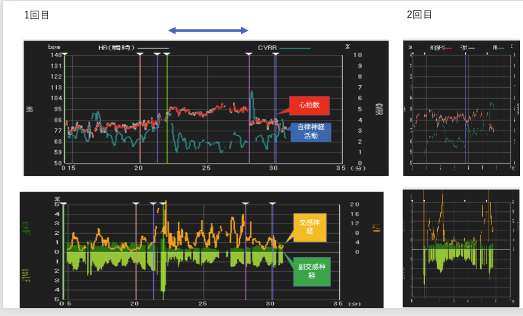 オレンジは交感神経です。面接中は上下を繰り返します。しかし、紫の線の部分ではオレンジの交感神経が下がっているのがわかります。同時に、緑の副交感神経が増えていることがわかります。